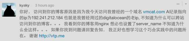 如果别人把我的IP地址绑到他的域名上, 那我就是在为别人搭博客了. 我本以为Nginx配置中的server_name选项可以进行阻挡, 看来不实践真的是不能轻易下结论.